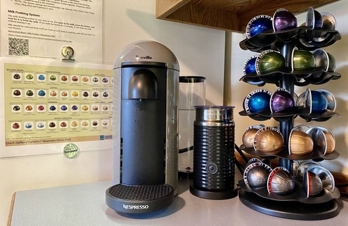 - Nespresso Vertuo Plus w/variety of pods, flavored syrups, sugar & sweeteners, and an assortment of teas.