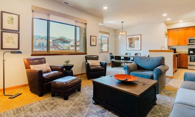 Downstairs is your fully-equipped kitchen, living room, dining area, powder bath, and lovely deck with ample seating to enjoy those views even more. Upstairs you have a King bedroom with an ensuite bathroom and another wow-view deck, as well as a Queen bedroom with a directly adjacent bathroom. The townhouse accommodates 4 guests, with the possibility of upgrading to 6 guests by using the sofa sleeper in the living room.