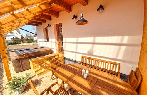 Newly built recreational cottage with 2x WHIRLPOOL (all year round), SAUNA and BATHING BIOTOPE with fenced garden and WIFI, Trampoline, just 300 m far from the ski lift Mladé Buky and 5 km from Trutnov.