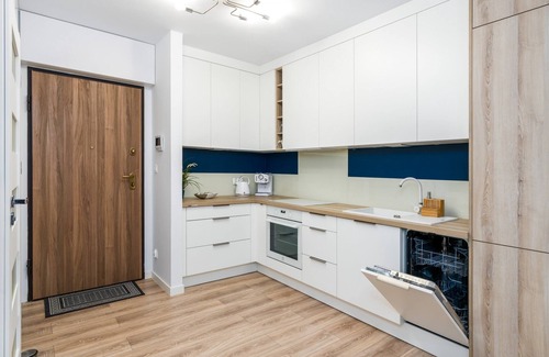 The stylish apartment suitable for 4 people or a couple. It consists of a living room, 1 bedroom, kitchenette and bathroom with shower. There is also a balcony with garden furniture and 2 assigned parking places in the underground garage (the fist place is behind the second one). Guests can take advantage of fully equipped kitchen, washing machine in bathroom and Tv in the living room. Kitchen is equipped with such aminities as a dishwasher, induction hob, oven, coffee machine and all the necessary kitchen utensils, tableware and cutlery. In the bedroom you will find a double bed and the living room is equpped with fold out sofa bed. There is also Wi-fi, which is absolutely free of charge.