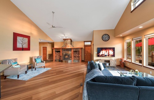 As you step onto the front porch, a rustic swing lounge welcomes you, providing the perfect vantage point to observe your guests' arrivals. The great room on the main level features a wood-burning fireplace, spacious living areas, and floor-to-ceiling windows that capture the essence of the evening West Coast sunshine and the beautiful sunsets.