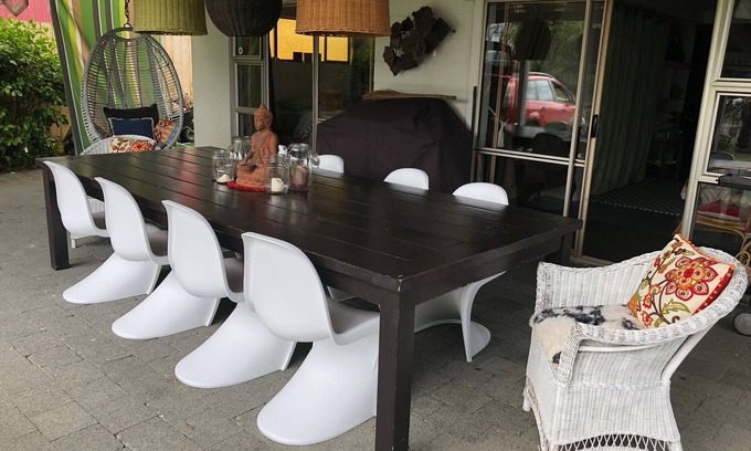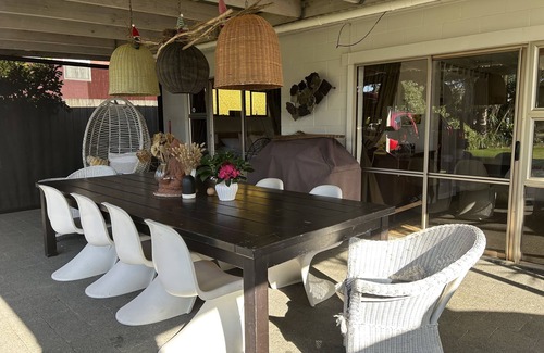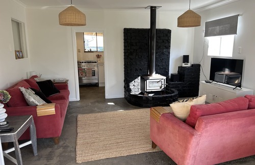 Hidden west coast treasure only 1:15 hr from Auckland, NZ. Come and discover Port Waikato and chill out with the sound of waves breaking and spectacular sunsets. This comfortable bach is an ideal retreat for couples or families and pets to unwind. Fully fenced with a big front lawn for a round of cricket! Safe for kids and pets (there is no need to leave your beloved 4 legged furry friends behind). 4 Bedrooms in the main house and a separate sleep out (sleeps 5) with its ownTV/ DVD is great for the kids/teenagers! or xtras - we even have a bed for your doggy. We have added a 9 x 5 meter pergola at the front which offers a very large outdoor extended living area - and a 3.25 meter table - superb for alfresco entertaining. We are a five minute walk to the beach and takeaway/cafe. Idyllic black sand beach, riverside and sand dune walks (best child or dog playground around ever). Great spot for fishing, whitebaiting, surfing and a patrolled beach for swimming - or just come, kick back and relax! or let the wonderful west coast clear away the cobwebs or stress. Fully equipped kitchen with 90cm stainless oven and gas hob / double door refrigerator / dishwasher / microwave. Wood burning fireplace for cosy winter stays we supply the wood! - treat yourself with a wild west coast beach walk and let the wind blow away your stress.... pure magic!