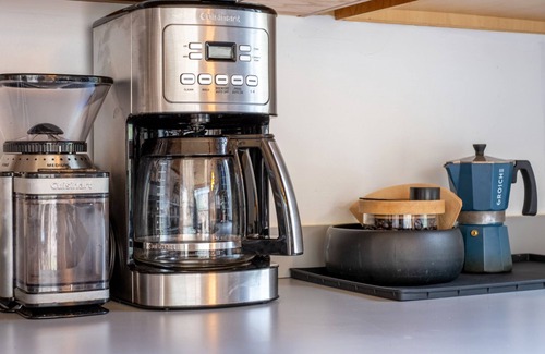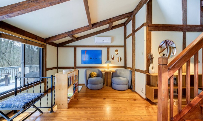 This cozy and quaint space is lined with exposed beams and interspersed with one-of-a-kind handmade wooden furniture. Inside you’ll find all the modern amenities: a fully-stocked eat-in kitchen with new KitchenAid stainless steel appliances, premium cookware, 14-cup Cuisinart Coffee Maker, grinder & bialetti for espresso lovers (fully stocked with coffee beans for your convenience). Leading into the common space we have a Danish fireplace for cold winter nights, and unique A-frame bedrooms with plenty of storage for your things.