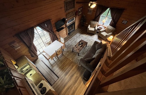 This luxury log cabin condo sleeps 8 and features 2 bedrooms (new mattresses- king in master, two queen beds in upstairs bedroom as of 3-4-2024)- queen sleeper sofa in living room- with soft linens), 2 bathrooms, HD Cable TV, Free Wifi, covered front porch, and outdoor deck complete with patio dining furniture and strung cafe lights. Perfect even for 2 adult couples, our cabin comfortably accommodates up to 7-8 people, especially if you have smaller kiddos that could share the sleeper sofa! Our property is dog friendly, too. *Note: this unit is a part of a log cabin four plex and sits at the top of about 15-17 steps.