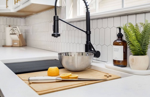 The gourmet kitchen makes meal prep a breeze, stocked with all the essentials and a workstation sink for convenience. A beautiful dining table comfortably seats eight, with additional seating at the island—perfect for gathering with family and friends. A full-size washer and dryer with detergent are also available, so you can pack light and stay fresh throughout your stay. Bathrooms are fully stocked with shampoo, conditioner, and body wash, so you’ll have everything you need for a comfortable stay.