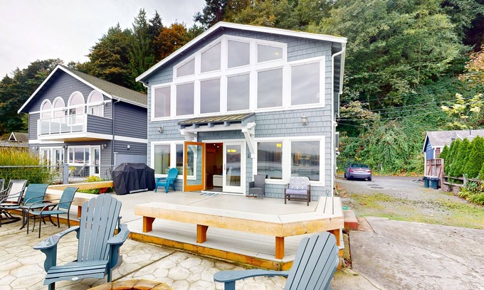 Perched on the shores of Port Susan, Whalehouse is a gorgeous waterfront 4BR/3BA home with fresh renovations and plenty of space for large family gatherings. Take in sweeping water views from the deck or the window-lined living room, where a gas fireplace adds a cozy touch. Wake to views of the waves in a private master suite, outfitted with another gas fireplace.