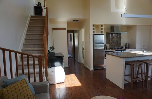 The layout of the first level has a beautiful open-living plan, with a modern, fully equipped kitchen. There's a queen size bedroom that opens up on to the deck, and a fully bathroom with a double head shower. The second level is made up of the second bedroom, also with a queen bed.