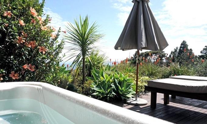 The Whenua Apartment at Koru Lodge is a spacious, two-level apartment. The unit has a private deck with a spa pool and space for lounging, with views of the Tasman Sea.