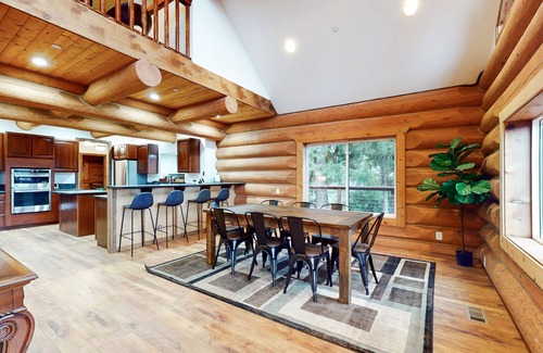 Back at your cabin, walk inside, and discover a spacious main living space. With vaulted ceilings, beautiful wood finishes, and modern amenities, this retreat has everything you need to make it feel like your home away from home. Lounge on the comfortable leather sofas kept warm from the heat of the fireplace, and tune into a movie on the large TV. In the adjacent full kitchen, the chef of your family can show off their culinary skills while utilizing the ample meal prep space, center island, and suite of stainless steel appliances.