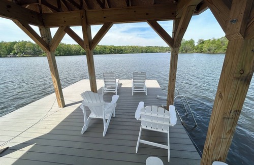 1500' gorgeous panoramic water frontage on 5 acres. Private dock/boat launch. Enjoy a fully-appointed property with the comforts of home, including coffee, linens, towels, hair dryer, make-up mirror, washer/dryer, Smart HDTV, gas grill, private dock with cover and stairs to enter/exit water, fire pit, and outdoor shower. Open floor plan, and ceiling fans in every room for that tropical feel. 3 bedrooms/2 baths with expansive waterfront views. Enjoy the day with a gorgeous sunrise and coffee on the deck, a kayak ride, a game of CornHole, and end your perfect day at the lake in Adirondack chairs with s'mores by the fire pit. Spacious private cove on the lake for boating, water sports, and convenient travel to lakeside gas/restaurants.