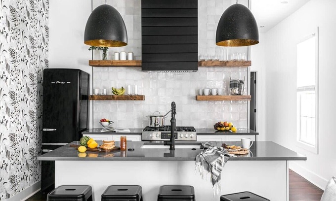 The kitchen features a slide in gas range and retro style fridge as well as a stainless steel dishwasher, microwave in the island and accented faucet. The entire wall has been clad in feature zellige tile and floating shelves With two pendant spotlights above the island. Throughout entire space runs vibrant, strong feature wall wallpaper that is a perfect backdrop for social! A pantry closet can be found just off the kitchen in the hallway and entrance to the bathroom.