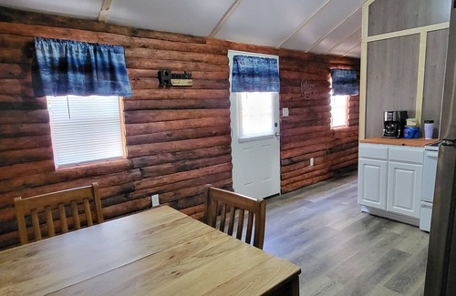 One bedroom has a queen bed with bedding and pillows. One bedroom has a full bed with bedding and pillows. Full kitchen with appliances and table. Bathroom has enough room to change clothes and not hit your elbows on everything around you. 40-inch TV and WIFI on property. All necessities you need to make a great memorable stay. Cabin sits on 3 acres.