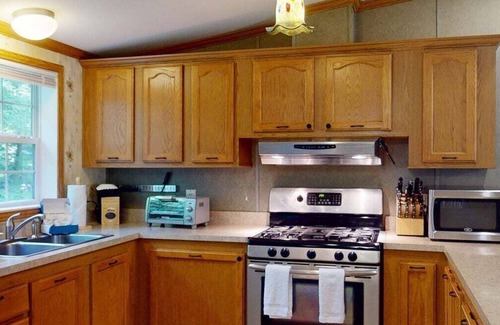 Nestled in the serene woods of Brandon, Vermont, Whispering Pines offers a tranquil retreat perfect for families and groups. This charming 3-bedroom rental home exudes a cozy and welcoming ambiance, making it an ideal getaway for up to 9 guests. The property boasts a picturesque woods view, providing a peaceful backdrop for your stay. Inside, you'll find two bedrooms, each furnished with a comfortable queen bed, and a third bedroom featuring a twin single bed and a bunk bed, which is perfect for children. The single-level home includes one well-appointed bathroom to cater to your needs.
