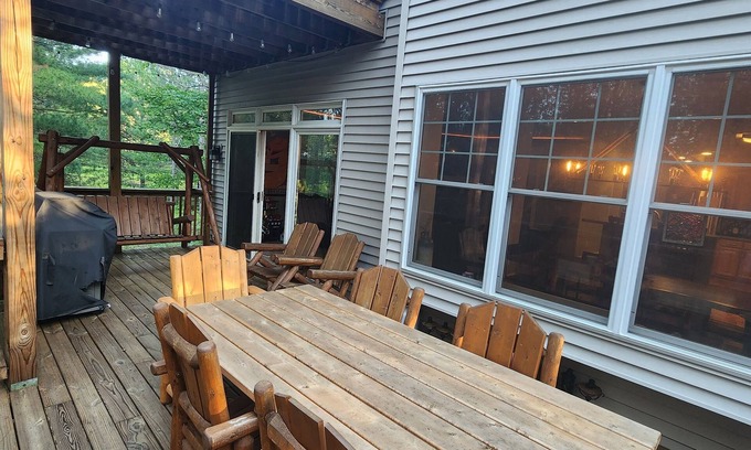 Whispering White Pines secluded, yet close to town ENTIRE TWO UNIT DUPLEX for rent. Two entire fully furnished units, boasting a total of 6 bedrooms and 4 baths spread thoughout a 2 story Duplex. With two fully furnished kitchens and livingrooms, and two seperate deck areas this home is the perfect getaway for your large and extended family stays.