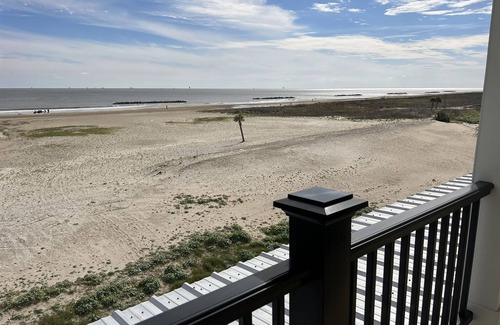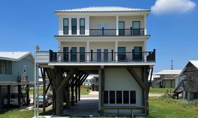 Great, newly built beachfront house great for family or friends looking for a great place to escape reality with breathtaking views. From Living area windows or out the front door with a great large porch for viewing or out from Master Bedroom with a private balcony overlooking the Gulf of Mexico for beautiful sunrises.The inside has lots of rooms for you and your guest to make yourself at home with wireless internet, T.V.'s in Living Room and some bedrooms, they have a Master Suite on second level with Private Bath feauturing a stand-alone tub with aerial window views of beach, double sink vanity, shower and balcony leading out to beachfront area for breattaking views. Bedrooms 2 and 3, which both have Queen beds, are connected with a Jack-n-Jill bathroom, and Bedroom 4 offers 2 sets of Queen bed custom-built bunk beds with wooden ladders for kids and adults to enjoy and own private bathroom with shower. The nearest golf cart crossover path is #2.5 Oak Lane.Cargo lift available on request.