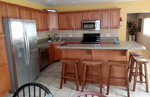 The kitchen has an island, kitchen table.Leading off from the kitchen is a full bathroom and a bedroom with a king bed. On the same side of the house is the sunroom (w sleeper sofa) that leads to the hot tub from one door and the pool through another. From the other side of the kitchen is the foyer, laundry room, BR, sitting area, 1st floor bedroom with a queen bed. A large living area is at the bottom of the stairs leading up to the other 2 bedrooms (1 Q bed & 2 DB beds) & bathroom. 1st floor full bath just remodeled Feb 2023. Pics not updated of remodeled bath