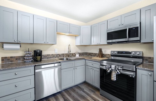 The home’s interior has been newly renovated with beautiful, modern furnishings and sophisticated décor. Two separate living areas include plush leather sofas, electric fireplaces, and smart TVs ensuring that there’s never an argument over what to watch. Host a movie night in one room while you stream the big game in the other! Two fully equipped kitchens allow for ample meal prep, both showcasing stainless steel appliances, stone countertops, and sleek cabinetry stocked with cookware and dining ware. Indulge in outdoor cooking with the convenience of a brand-new Pit Boss griddle at your disposal. Dining options are plentiful as well with tables in either kitchen accommodating 8 and 4, respectively.