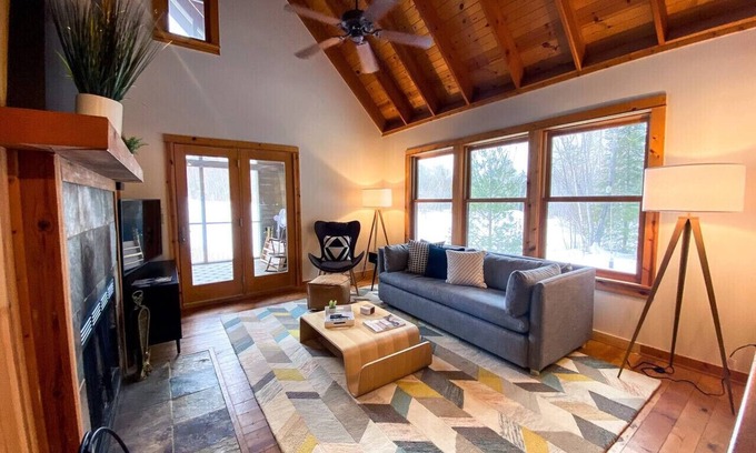 The White Pine Chalet features a modern Nordic design aesthetic and an incredibly cozy layout. Wood burning fireplace, meadow views from the screened-in porch, and brand new furnishings from top to bottom. The main level features a king suite with a walkout and an adjacent bathroom. The expansive screened-in porch has a formal dining and lounge space, perfect for an evening dinner in the Summers or stargazing in the great northwoods. The fully-stocked kitchen is perfect for entertaining your guests. The living room has a smart TV with a Bose bluetooth soundbar, a wood-burning fireplace, and a memory foam sleeper sofa for a fifth guest. Up the stairs is a queen lofted bedroom with lounge space, bathroom, and a yoga/work room.