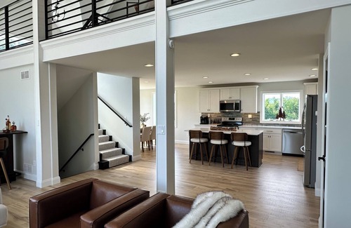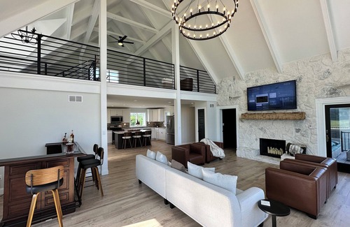Serene hilltop retreat with panoramic views and refined comfort. Perfect for families, groups, or wedding parties, White Pines Lodge blends nature with upscale amenities. Open-plan living with floor-to-ceiling windows and a grand stone fireplace. Fully equipped with premium appliances in a spacious kitchen big enough to host large gatherings or cook for several families. Luxurious king master with seating area to relax in your own wing of the house. Spa-like master en suite has a 6’x12’ wet room equipped with a soaking tub, double rainfall shower heads, body sprayers, hand wands and a spacious double vanity. Two additional king bedrooms, one of which has a fireplace. Loft has plenty of room with two queen beds and a seating area. Washer and dryer with supplies. Indoor home bar with large living room, great for entertainment, Large deck, fire pit, and smart TVs in all bedrooms. Close proximity to wineries, breweries, and a venue nearby.