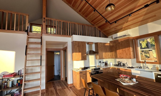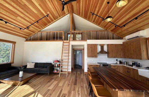 Relax with the whole family at this peaceful place to stay. Beautiful, well appointed, brand new all wood chalet style construction with amazing Mt Hood and nearby Columbia River views. Set in a serene open stand of trees well spaced from any neighboring properties. Close to top kite and windsurf launches, wineries, White Salmon River rafting and kayaking, and incredible fishing, hiking and mountain biking. Incredibly quiet yet only 5 minutes from the best downtown White Salmon restaurants. The whole house is available as shown. We do use a small basement apartment with separate entrance next to the garage for ourselves at times but we will not bother you.