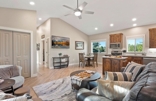 Step into the open-concept living room, kitchen, and dining area — an ideal space for planning adventures, sharing meals, and winding down after a day in Yellowstone National Park.