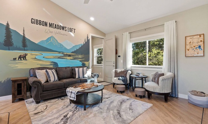 Relax in a living room that pays tribute to the natural wonders of Yellowstone National Park. A hand-painted mural transports you to a mountain landscape where bears roam freely.