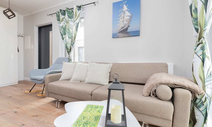 The modern Wiatrakowa apartment in the seaside town of Jastrzębia Góra can accommodate up to 4 people - perfect for a trip with family or friends! The apartment consists of a living area with a kitchenette, a bedroom and a bathroom with a shower. Modern interior design in shades of white and gray with the use of floral and colorful elements of the decor and high-quality furnishings guarantee an unforgettable stay. The terrace in front of the house is an ideal place to relax in the fresh air, relaxing on the sun loungers.