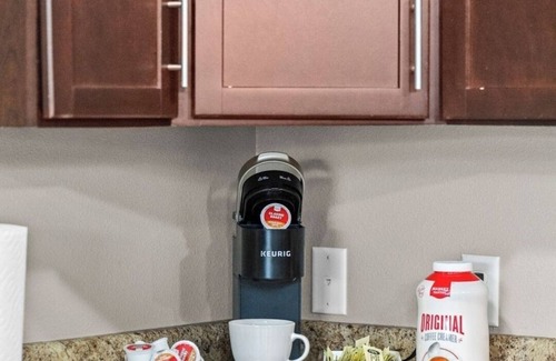 The unit is spacious but you'll find all the accommodations of home. As you enter the front door, you're greeted by the large and expansive kitchen, stocked with all the basic appliances you would need (toaster, Keurig, microwave, etc) as well as bakeware, kitchen gadgets, etc. as well as plenty of seating! If you're bringing a little one, you'll find a high-chair as well.