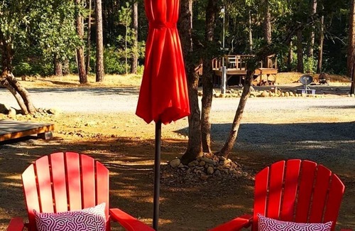 Love camping but don’t want to sacrifice comfort? Our beautifully furnished air-conditioned Tipi has a King size adjustable Serta Hybrid mattress, a mini-fridge & a Keurig coffee maker. Enjoy romantic starry nights on the oversized deck in a peaceful meadow with a propane firepit. Relax by the pond, explore the Oregon Caves, scenic mountains, wineries, or the rugged coast. A bright lantern and soft towels are provided. Bathrooms and showers are steps away. Our Ultimate Glamping Luxury Tipi.