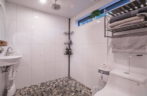 Inside the walls are real shiplap and ceilings are tongue and groove pine. Floors are engineered wood with a few rugs. Bathroom spa vibes start with a custom cedar sauna door which reveals an oversized shower and bathroom in a peaceful stone tile environment.