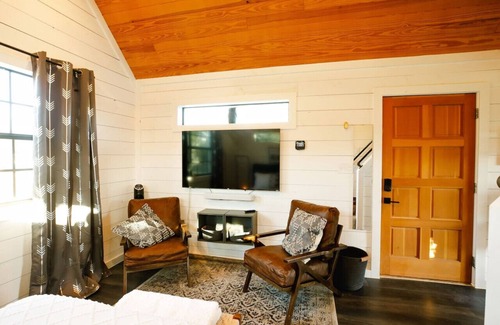 This farmhouse-modern tiny cabin is perched over a small hill country canyon at Wanderin’ Star Farms in Dripping Springs, Tx. The cabin has a wonderfully private back porch, upstairs reading loft, and a spa-like all in one shower + bathroom.