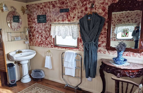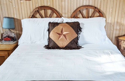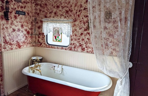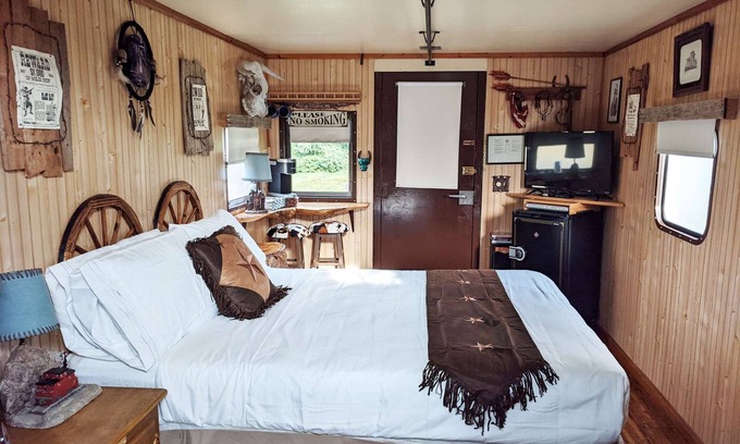 Hop onboard our western themed caboose and "take a ride" on the wild side. Keep a weathered eye on the horizon for greedy bad guys from the height of our cupola lookout cowhide seats. Travel back in time through saloon batwing doors and find yourself soaking in an antique 1910 claw foot tub. This good ol train car has seen a few gunshots back in the days but now it offers such comforts as an electric fireplace, a flatscreen TV with a DVD player, a mini fridge and a coffee maker. The front of the rail car has a small bar-style table and a queen bed.
