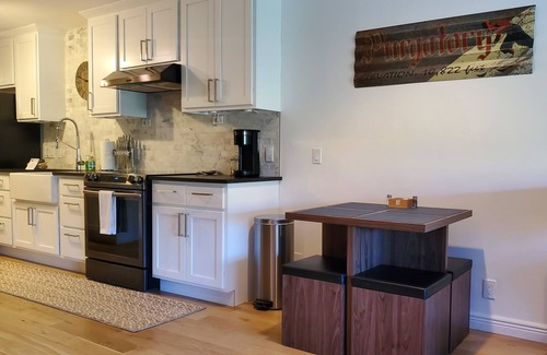 This fully remodeled studio has a true full kitchen with new cabinetry and appliances, with a small dining table and chairs adjacent to the kitchen. New flooring, new King size bed, new bedding! You can fold up the Murphy bed during your stay to create much more floor space for morning stretches or to have the ability to move the living chairs around the room to suit your needs. You'll enjoy a lovely electric fireplace for your stay - cleverly hidden in the TV cabinet. The bathroom is modern and clean. This condo also has a ski/snowboard rack and boot tray for our winter sports enthusiasts! We do have AC, as well as two ceiling fans to keep the air moving.