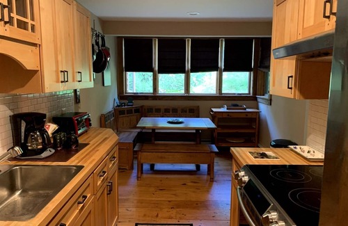 The first floor of this Adirondack-style home holds a fully equipped kitchen with breakfast nook, a dining area, a living room with a sleeper sofa, a cozy wood-burning fireplace, a TV with DVD player/DVDs, board games, and a full bath. There is also a closet to store your coats and boots. The second floor has two en-suite bedrooms that both hold queen beds with private baths and a washer/dryer located between the bedrooms. There is a good-sized deck with a BBQ grill to enjoy the outdoors and a detached garage is available for storage of your sporting supplies (a car will not fit and watercraft are for public use).