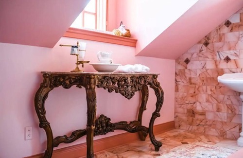 "Up, up and away," the room of dormers is "pretty in pink" and salmon colors. This is an enchanting area for our guests with its elegant and vintage chandeliers. The friendly ambiance draws both the nostalgic and young of hearts. The antique tiled bathroom is a "wow factor" unto itself.