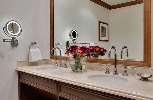 The primary bedroom boasts a king bed and an en-suite bathroom designed with accessibility in mind. It features a double sink, a stone top vanity, a fully tiled walk-in shower with a glass Euro door, and a luxurious Jacuzzi tub. The second bedroom offers two twin beds that can be converted into a king bed upon request. The adjacent secondary bathroom includes a stone top vanity and a fully tiled tub/shower combination. Both bedrooms are equipped with wall-mounted flat-screen TVs.