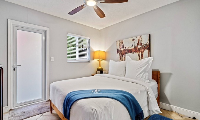 A beautiful space with a private entrance and a cute outdoor area. Newly furnished and remodeled. Great location, just steps from Wilton Drive and many cool bars and restaurants, minutes from "Downtown Las Olas" and the Beach. LGBTQ+ friendly and dog friendly. Two bedrooms, one very comfortable queen bed, and a full bed in the other. Both featuring our brand-new Le Chateau Soft Cloud Percale luxury bed linen for a heavenly sleep experience every time. The property is located in quiet, residential Wilton Manors.