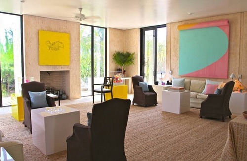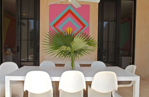 The grand entry of Savannah leads into a large and sunny dining room. To the right stands the master bedroom and to the left, the bunk bed room. Beyond, the large high-ceilinged living room is soft and cool with bold sculptural paintings dominating the walls. Another guest room is off to one side, and the renovated kitchen to the other.