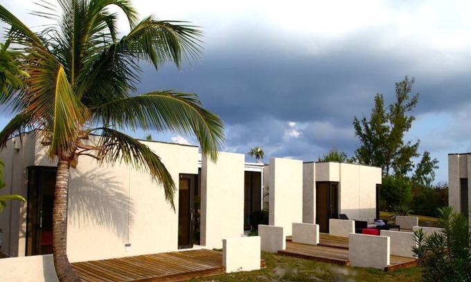 Savannah is a short walk from the sea and beach from atop its private knoll. Its storm-safe concrete-block walls are coated with plaster mixed with honey-coloured lime stone dust from a local quarry and textured with seashells. A light raft-like walking deck surrounds the house.