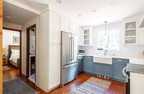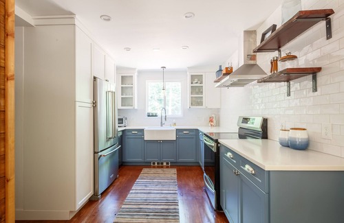 The house is entirely renovated. The kitchen is fully equipped and waiting for your imagination. There is a full bathroom on each floor. The first floor bedroom has a queen bed, on the second floor there is a bedroom with two bunk beds and a bedroom with two twin beds. There's a large covered deck with Adirondack chairs, swing bed and gas grill. We recently added a pizza oven and a cozy BBQ hut where you can cook, roast marshmallows or just sit around the fire on chilly days and nights. The hut tub is covered so it can be enjoyed in any weather and it sits on a platform with a bar and chairs. There's also a fire pit and plenty of wood.