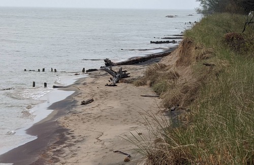 A note from the owner: Historically high water levels on Lake Michigan have caused severe erosion of the beaches in most areas beginning in 2019. The water level has gone down by a couple of feet by late 2021, early 2022 leaving about 40 to 50 feet of beach. I have tried to post more recent photos of the beach but the amount of beach and access varies widely depending on the time of year, wind and wave conditions, etc. Please request current photos and ask questions. The owner makes no guarantees as to lake level or access beyond what is known at the current time.