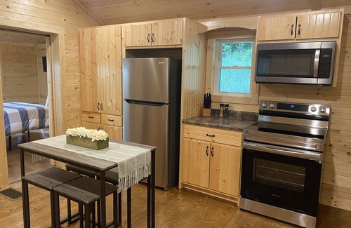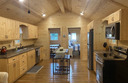 Quiet secluded New cabin, full kitchen, laundry room In each bedroom. Tv in each bedroom with Roku disney +, Amazon prime video, paramount +, Netflix, and Hulu. Lots of near by hiking trails and tubing