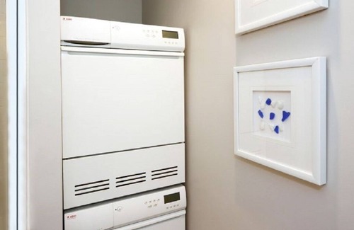 The bathroom has 2 separate sinks, a walk-in shower, a toilet and a washing machine and dryer.