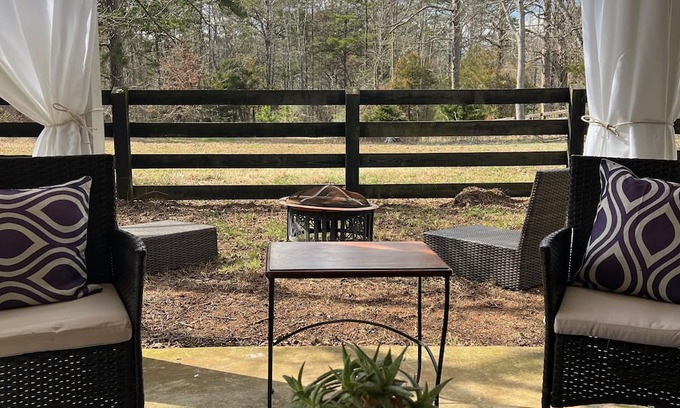 Enjoy the back patio with romantic string lighting, seating and a fire pit to enjoy the country view.