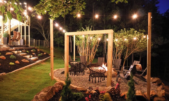 There are FOUR fire features in the home! There is a wood-burning stove in the living room, a gas fire pit to enjoy on cozy mornings or in the evenings on each level of the deck and terrace, and a large gathering fire pit with swing chairs to roast marshmallows and has the perfect camp-like vibe to it!