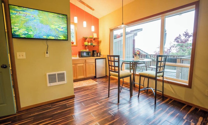 This lovely tree top space is attached to our home and includes separate entry, complete privacy in the unit, has its own upstairs deck, and includes the use of our shared lower deck and hot tub. The kitchen is a "kitchenette" with no stove, but we do provide a single burner hot plate.