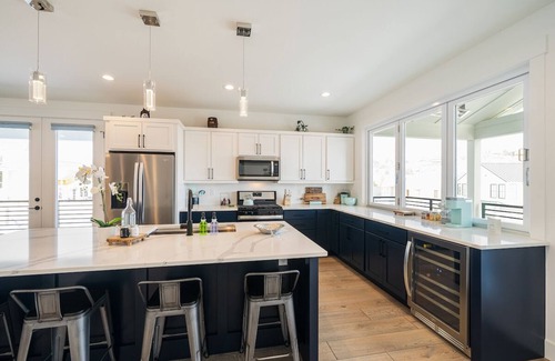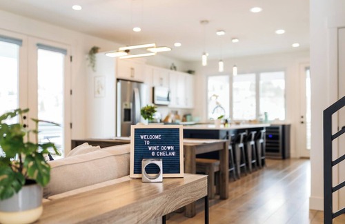 Wine Down at Chelan sits on a premium corner lot overlooking the vineyard, close to the Olympic-sized pool and large hot tub. The home offers three levels of luxury living, including five bedrooms and 4.5 baths, with the primary suite on the main floor and another on the upper level. Each floor has its thermostat to set comfortable temperatures all day long. With all the charm of a cozy mountain lake cottage, the home offers ample, modern spaces that accommodate large families or couples retreats.
