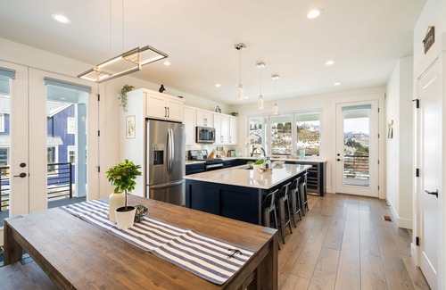 Inside the home, the main floor is open with a large living room, dining room, kitchen, pantry, and powder bath. The kitchen features a collapsible window system that extends the outdoor space to the generous deck space with a window bar. Kick back on the large sectional and enjoy the LG SmartTV, Sonos Beam, and dual-sided fireplace. Thoughtfully designed, Master Bedroom Suite 1 welcomes you with a comfortable king bed, a fan, a work-from-home table, and an ensuite bathroom.