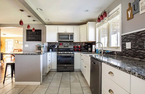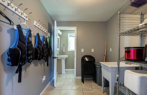 Walk back into the Living room and straight into the Dining room with large expandable dining table and plenty of extra seating. The large Dining room is attached to the beautifully open Chef's kitchen, fully equipped and boasting stainless steel appliances (stove, microwave, dishwasher and refrigerator). The large farm house sink is placed in direct view of the lake. Enjoy those stunning views while making dinner or having a glass of wine at the island. The kitchen has plenty of storage and access to the back deck for even more entertaining possibilities. Adjoining the kitchen is a Mud room and half bath.
