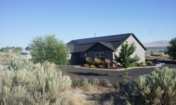 Beautiful solar powered home for couples who enjoy wine tasting and hosting friends. Yelp shows there are 40 wineries, tasting rooms or vinyard within a ten mile radius of this property. Enjoy a 360 degree stunning view which includes Rattlesnake Mountain, the orchards and vineyards of Benton City, WA, plus the orchards and vineyards of Red Mountain. Interesting wine note: Red Mountain has it's own AVA. Entertain friends on the patio while relaxing in comfortable outdoor chairs. Soak in the beautiful sunsets. Enjoy cooking in a well-stocked kitchen with large spice collection or outside on the BBQ. Kitchen has a conventional oven and stove top as well as a microwave and air-fryer.